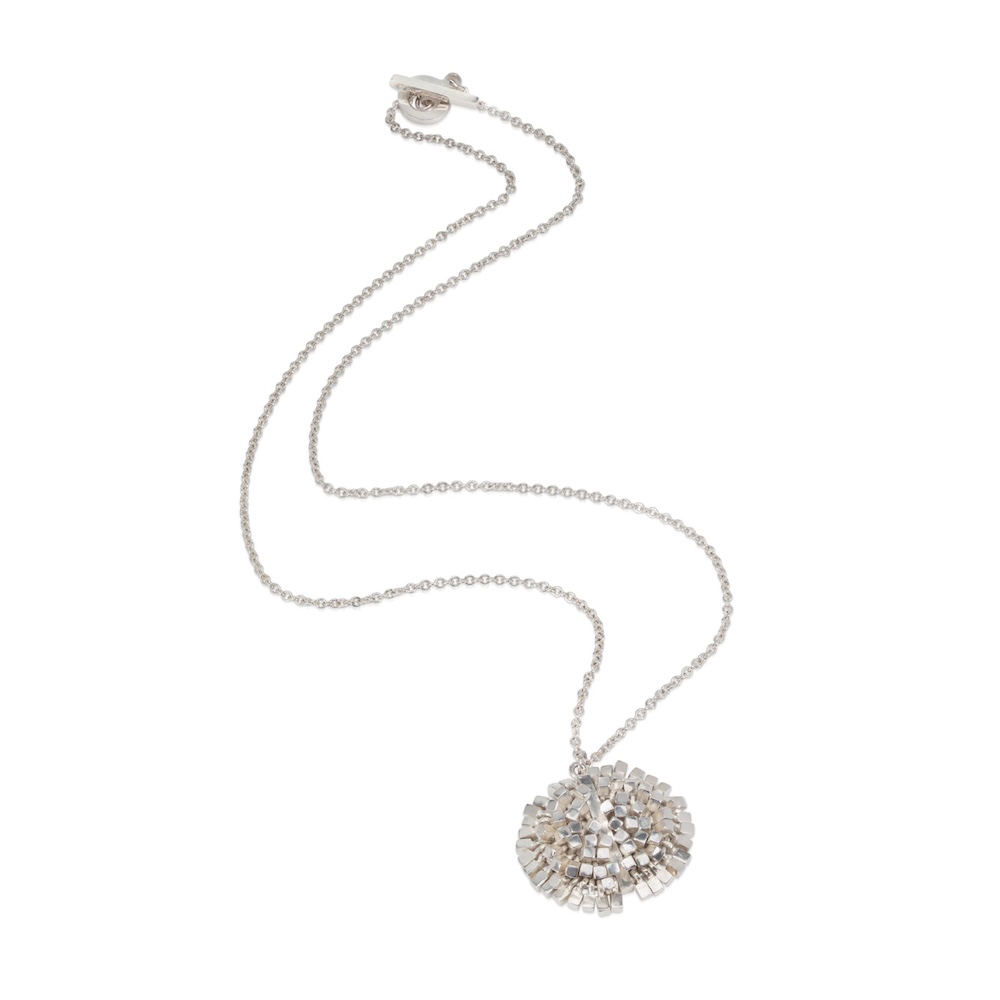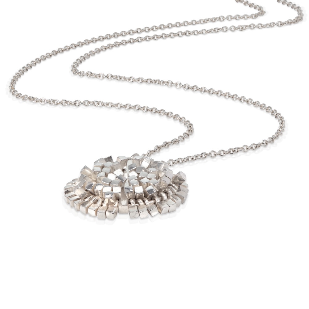 Description - a circular silver pendant with rows of cubes which move individually radiating out in 4 rows. The pendant hangs on a silver chain with a handmade T bar clasp which carries the hallmark.